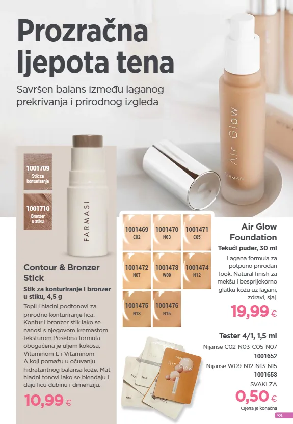 Prozračna ljepota tena Air Glow Foundation Tekući puder, 30 ml Lagana formula za potpuno prirodan look. Natural finish za mekšu i besprijekorno glatku kožu uz lagani, zdravi, sjaj. 19,99 € 1001473 W09 1001471 C05 1001475 N13 1001470 N03 1001474 N12 1001472 N07 1001476 N15 1001469 C02 Tester 4/1, 1,5 ml 1001652 1001653 Nijanse C02-N03-C05-N07 SVAKI ZA Nijanse W09-N12-N13-N15 0,50 € Cijena je konačna Savršen balans između laganog prekrivanja i prirodnog izgleda 10,99 € 1001709 Stik za konturisanje 1001710 Bronzer u stiku Contour & Bronzer Stick Stik za konturiranje i bronzer u stiku, 4,5 g Topli i hladni podtonovi za prirodno konturiranje lica. Kontur i bronzer stik lako se nanosi s njegovom kremastom teksturom.Posebna formula obogaćena je uljem kokosa, Vitaminom E i Vitaminom A koji pomažu u očuvanju hidratantnog balansa kože. Mat hladni tonovi lako se blendaju i daju licu dubinu i dimenziju. 33 1001709 1001710 1001473 1001471 1001475 1001470 1001474 1001472 1001476 1001469 1001652 1001653