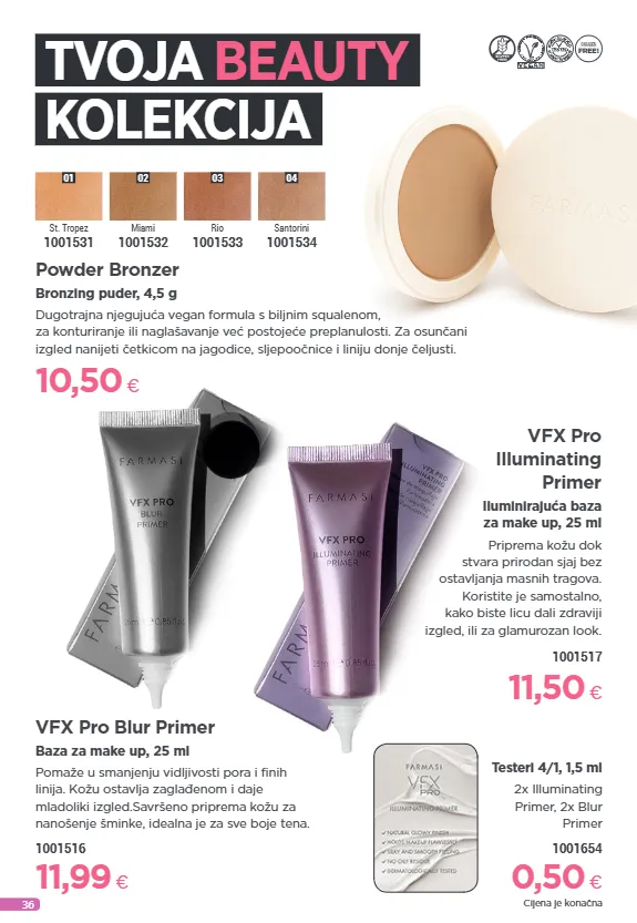 Powder Bronzer Bronzing puder, 4,5 g Dugotrajna njegujuća vegan formula s biljnim squalenom, za konturiranje ili naglašavanje već postojeće preplanulosti. Za osunčani izgled nanijeti četkicom na jagodice, sljepoočnice i liniju donje čeljusti. 10,50 € 36 VFX Pro Blur Primer Baza za make up, 25 ml Pomaže u smanjenju vidljivosti pora i finih linija. Kožu ostavlja zaglađenom i daje mladoliki izgled.Savršeno priprema kožu za nanošenje šminke, idealna je za sve boje tena. VFX Pro Illuminating Primer Iluminirajuća baza za make up, 25 ml Priprema kožu dok stvara prirodan sjaj bez ostavljanja masnih tragova. Koristite je samostalno, kako biste licu dali zdraviji izgled, ili za glamurozan look. 11,99 € 11,50 € 1001516 1001517 0,50 € 1001654 Cijena je konačna Testeri 4/1, 1,5 ml 2x Illuminating Primer, 2x Blur Primer 01 1001531 St. Tropez 03 1001533 Rio 02 1001532 Miami 04 1001534 Santorini TVOJA BEAUTY KOLEKCIJA PARABEN FREE! 1001531 1001533 1001532 1001534 1001516 1001517 1001654