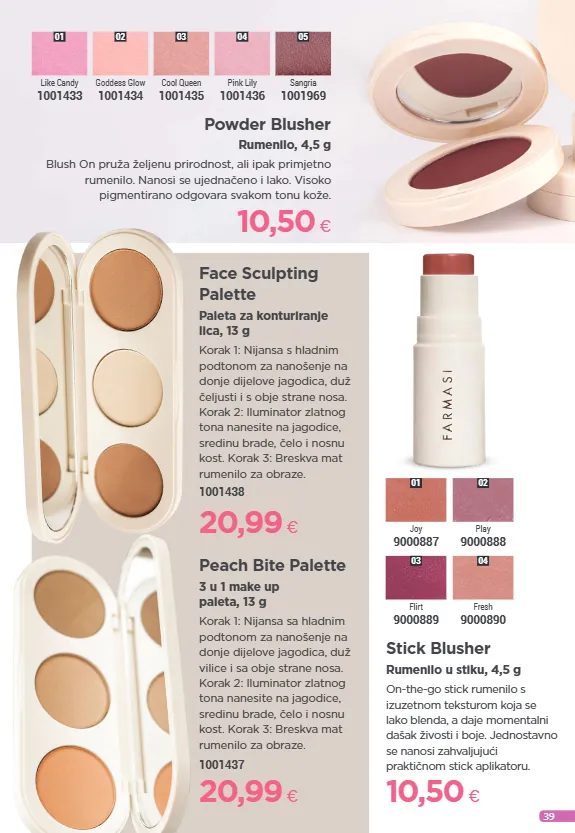 10,50 € Stick Blusher Rumenilo u stiku, 4,5 g On-the-go stick rumenilo s izuzetnom teksturom koja se lako blenda, a daje momentalni dašak živosti i boje. Jednostavno se nanosi zahvaljujući praktičnom stick aplikatoru. 01 9000887 Joy 03 9000889 Flirt 02 9000888 Play 04 9000890 Fresh Powder Blusher Rumenilo, 4,5 g Blush On pruža željenu prirodnost, ali ipak primjetno rumenilo. Nanosi se ujednačeno i lako. Visoko pigmentirano odgovara svakom tonu kože. Face Sculpting Palette Paleta za konturiranje lica, 13 g Korak 1: Nijansa s hladnim podtonom za nanošenje na donje dijelove jagodica, duž čeljusti i s obje strane nosa. Korak 2: Iluminator zlatnog tona nanesite na jagodice, sredinu brade, čelo i nosnu kost. Korak 3: Breskva mat rumenilo za obraze. 1001438 20,99 € 10,50 € 1001437 20,99 € Peach Bite Palette 3 u 1 make up paleta, 13 g Korak 1: Nijansa sa hladnim podtonom za nanošenje na donje dijelove jagodica, duž vilice i sa obje strane nosa. Korak 2: Iluminator zlatnog tona nanesite na jagodice, sredinu brade, čelo i nosnu kost. Korak 3: Breskva mat rumenilo za obraze. 01 1001433 Like Candy 03 1001435 Cool Queen 02 1001434 Goddess Glow 04 1001436 Pink Lily 05 1001969 Sangria 39 1001433 1001435 1001434 1001436 1001969 9000887 9000889 9000888 9000890 1001438 1001437