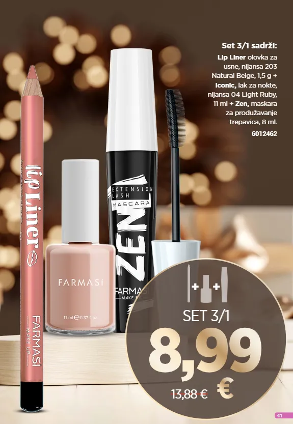 41 6012462 set 3/1 sadrži: lip liner olovka za usne, nijansa 203 natural beige, 1,5 g + iconic, lak za nokte, nijansa 04 light ruby, 11 ml + zen, maskara za produžavanje trepavica, 8 ml. 8,99 € 13,88 € set 3/1 + + 6012462