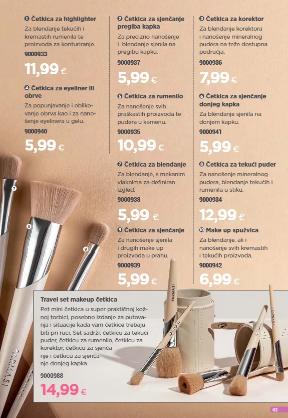 43 9000933 9000937 9000940 9000935 9000936 9000941 9000938 9000939 9000942 9000934 9 8 7 1 Četkica za highlighter Za blendanje tekućih i kremastih rumenila te proizvoda za konturiranje. 2 Četkica za sjenčanje pregiba kapka Za precizno nanošenje i blendanje sjenila na pregibu kapku. 4 Četkica za eyeliner ili obrve Za popunjavanje i obliko- vanje obrva kao i za nano- šenje eyelinera u gelu. 5 Četkica za rumenilo Za nanošenje svih praškastih proizvoda te pudera u kamenu. 3 Četkica za korektor Za blendanje korektora i nanošenje mineralnog pudera na teže dostupna područja. 6 Četkica za sjenčanje donjeg kapka Za blendanje sjenila na donjem kapku. 7 Četkica za blendanje Za blendanje, s mekanim vlaknima za definiran izgled. 9 Četkica za sjenčanje Za nanošenje sjenila i drugih make up proizvoda u prahu. 10 Make up spužvica Za blendanje, ali i nanošenje svih kremastih i tekućih proizvoda. 8 Četkica za tekući puder Za nanošenje mineralnog pudera, blendanje tekućih i rumenila u stiku. 11,99 € 5,99 € 5,99 € 10,99 € 7,99 € 5,99 € 5,99 € 5,99 € 6,99 € 12,99 € 9000933 9000937 9000940 9000935 9000936 9000941 9000938 9000939 9000942 9000934 14,99 € 9000988 Travel set makeup četkica Pet mini četkica u super praktičnoj kož- noj torbici, posebno izdanje za putova- nja i situacije kada vam četkice trebaju biti pri ruci. Set sadrži: četkicu za tekući puder, četkicu za rumenilo, četkicu za korektor, četkicu za sjenča- nje i četkicu za sjenča- nje donjeg kapka. 9000933 9000937 9000940 9000935 9000936 9000941 9000938 9000934 9000988 9000939 9000942