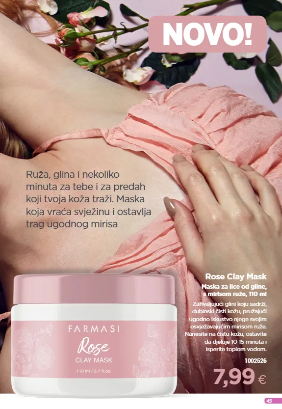 45 rose clay mask maska za lice od gline, s mirisom ruže, 110 ml zahvaljujući glini koju sadrži, dubinski čisti kožu, pružajući ugodno iskustvo njege svojim osvježavajućim mirisom ruže. nanesite na čistu kožu, ostavite da djeluje 10-15 minuta i isperite toplom vodom. 7,99 € 1002526 novo! ruža, glina i nekoliko minuta za tebe i za predah koji tvoja koža traži. maska koja vraća svježinu i ostavlja trag ugodnog mirisa 1002526
