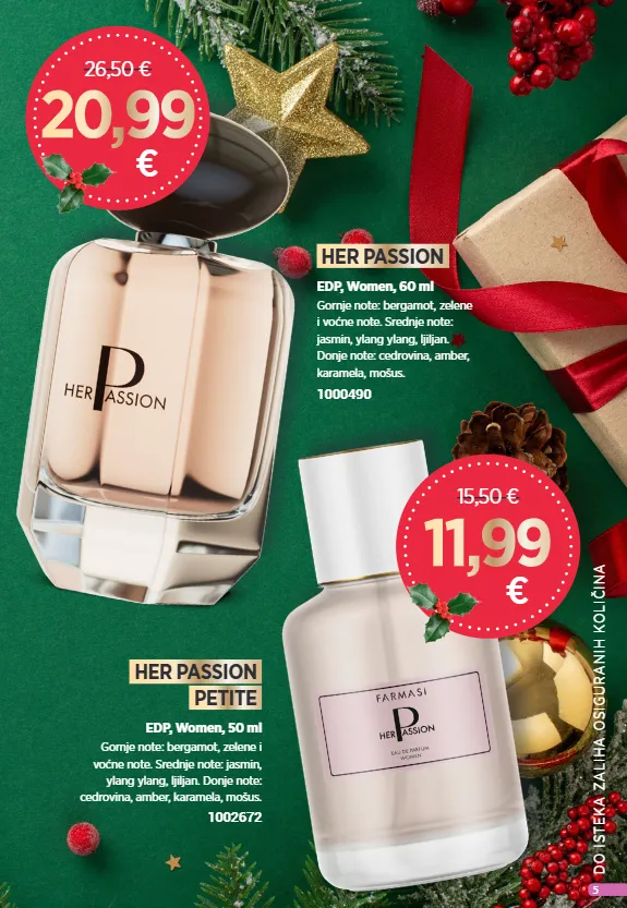5 her passion edp, women, 60 ml gornje note: bergamot, zelene i voćne note. srednje note: jasmin, ylang ylang, ljiljan. donje note: cedrovina, amber, karamela, mošus. 1000490 1002672 her passion petite edp, women, 50 ml gornje note: bergamot, zelene i voćne note. srednje note: jasmin, ylang ylang, ljiljan. donje note: cedrovina, amber, karamela, mošus. 20,99 € 26,50 € 11,99 € 15,50 € do isteka zaliha osiguranih količina 1000490 1002672