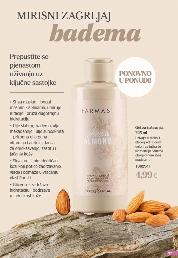 99 gel za tuširanje, 225 ml uživajte u mekoj i glatkoj koži s ovim gelom za tuširanje uz esenciju badema obogaćenom shea maslacem. 1002341 4,99 € mirisni zagrljaj badema ponovno u ponudi! prepustite se pjenastom uživanju uz ključne sastojke • shea maslac – bogat masnim kiselinama, umiruje iritacije i pruža dugotrajnu hidrataciju • ulje slatkog badema, ulje makadamije i ulje suncokreta – prirodna ulja puna vitamina i antioksidansa za omekšavanje, zaštitu i jačanje kože • skvalan – lipid identičan koži koji potiče zadržavanje vlage i pomaže u vraćanju elastičnosti • glicerin – zadržava hidrataciju i podržava mladolikost kože 1002341