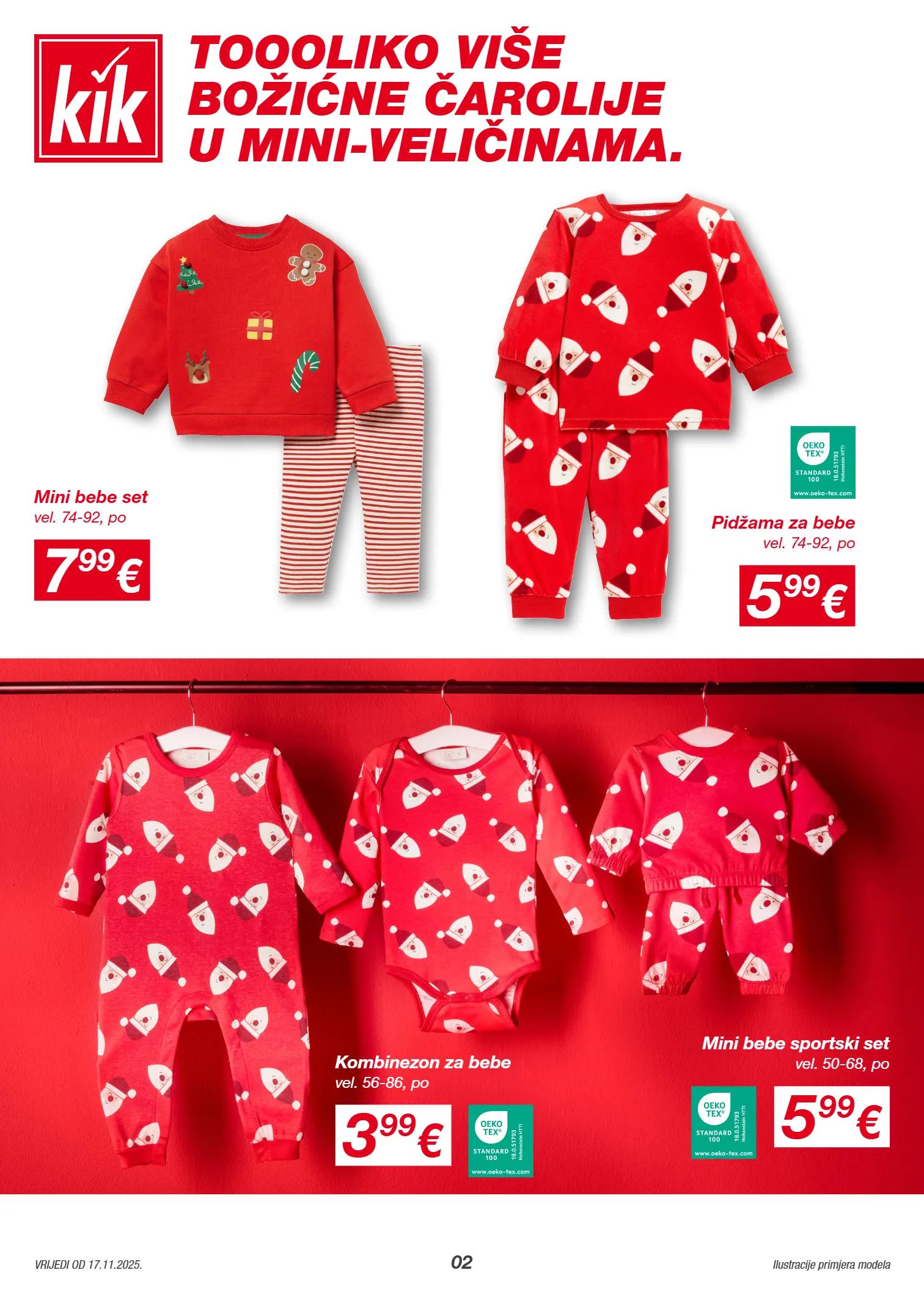1201211 1207503 1201196 1206450 02 vrijedi od 17.11.2025. ilustracije primjera modela 7 99 € vel. 74-92, po mini bebe set 5 99 € vel. 74-92, po pidžama za bebe 3 99 € vel. 56-86, po kombinezon za bebe 5 99 € vel. 50-68, po mini bebe sportski set toooliko više božićne čarolije u mini-veličinama.