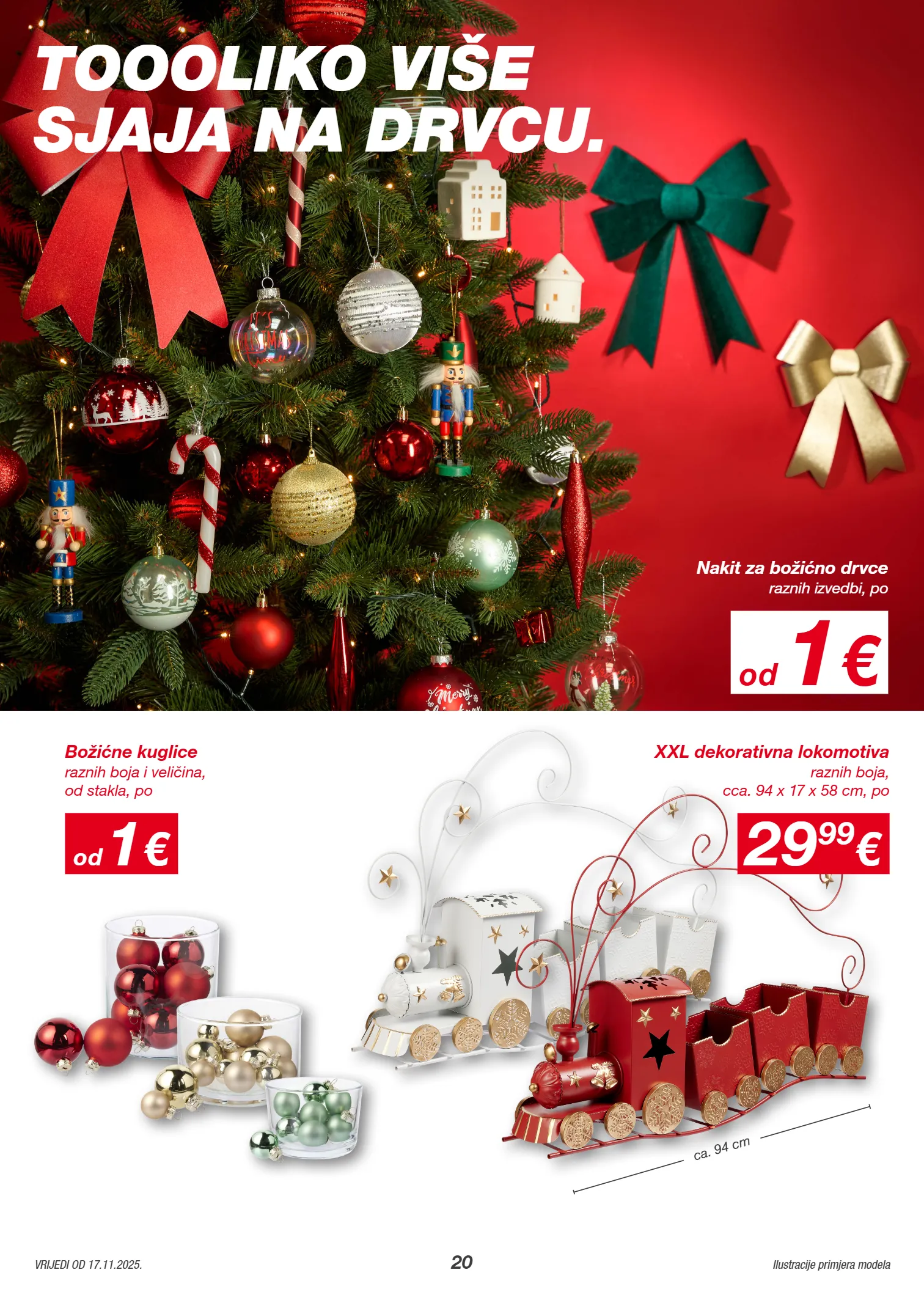 1206705 1206785 1206786 1206787 20 VRIJEDI OD 17.11.2025. Ilustracije primjera modela ca. 94 cm od 1 € raznih boja i veličina, od stakla, po Božićne kuglice 29 99 € raznih boja, cca. 94 x 17 x 58 cm, po XXL dekorativna lokomotiva od 1 € raznih izvedbi, po Nakit za božićno drvce TOOOLIKO VIŠE SJAJA NA DRVCU.